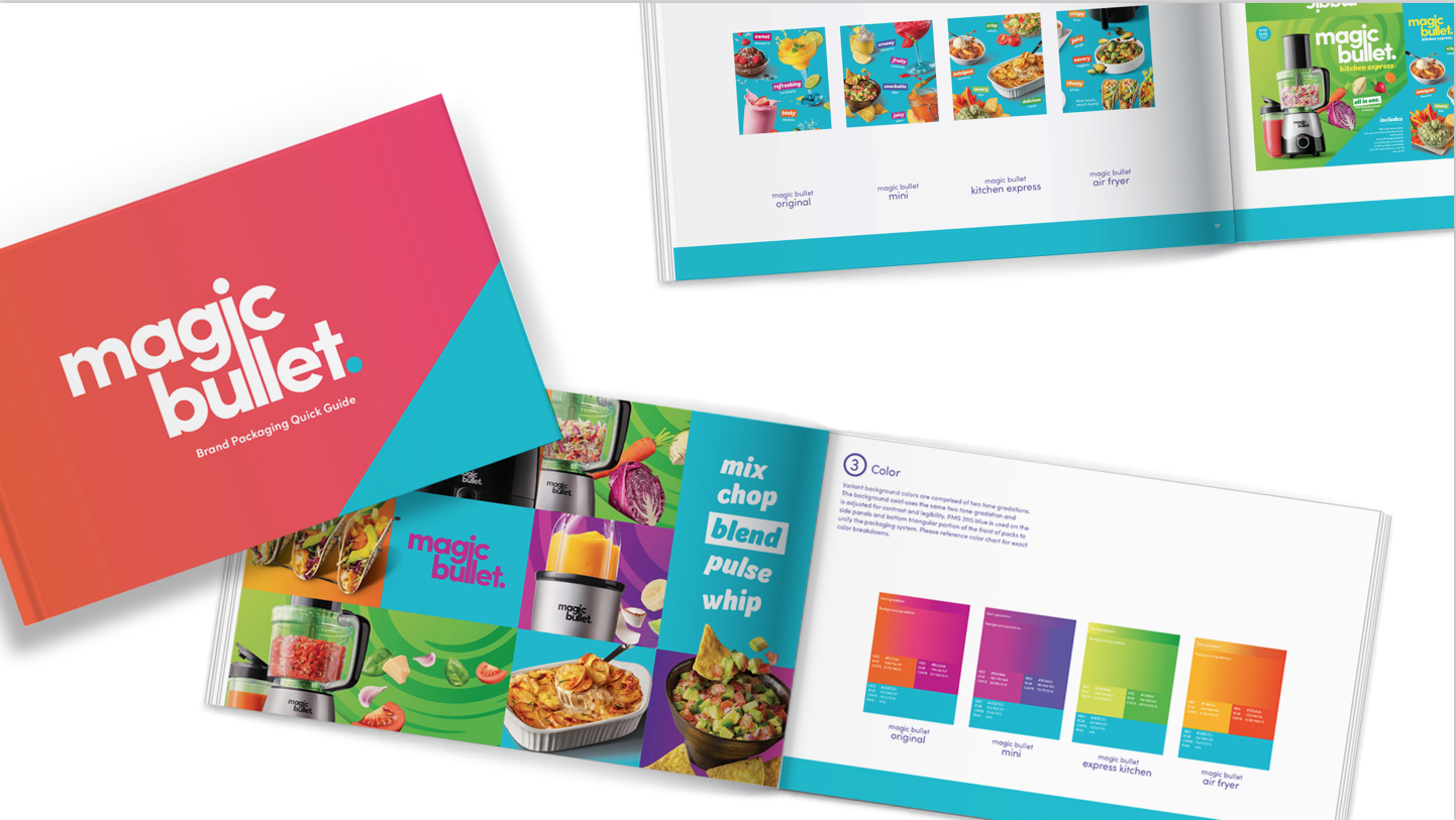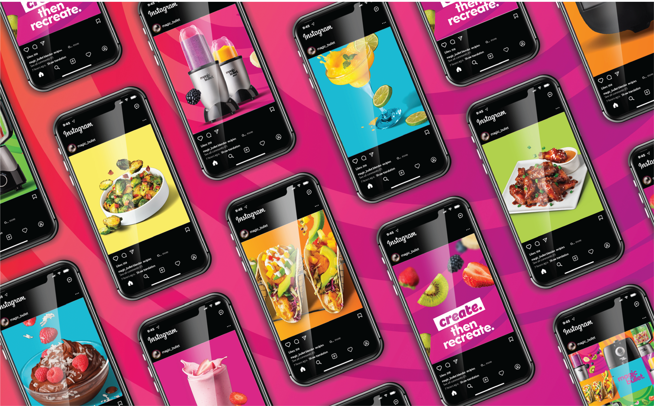 Smith Design created a compelling and exciting new presence on shelf and online for Magic Bullet, Magic Bullet Mini, Kitchen Express, and Air Fryer, separating it from its sister product NutriBullet, as the go-to brand for small format home electronics with satisfying price points that offer quick cooking solutions. With Gen Z and young Millenials in mind, the design positions the product as devices for self-exploration and expression in the kitchen, with a focus on bold colors, movement, and enticing dishes and ingredients.